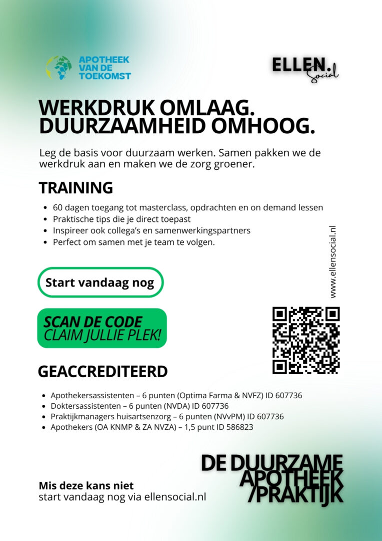 Doe mee met de geaccrediteerde training De Duurzame Apotheek/Praktijk (samen met Hanneke van Andel). Inclusief live masterclass op 1 oktober en toegang tot de online leeromgeving.